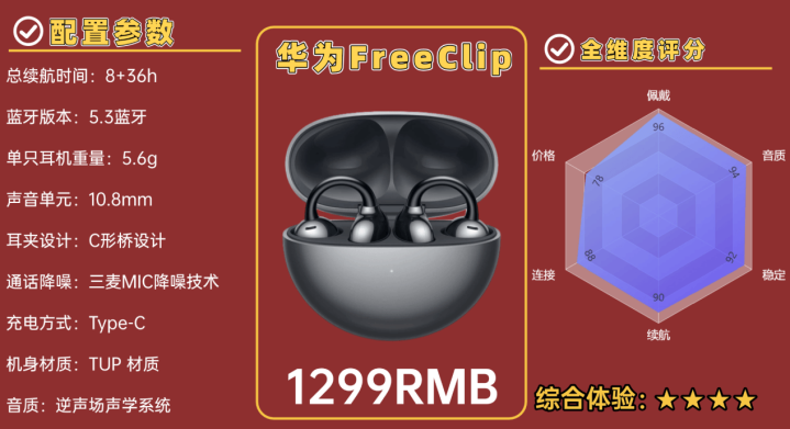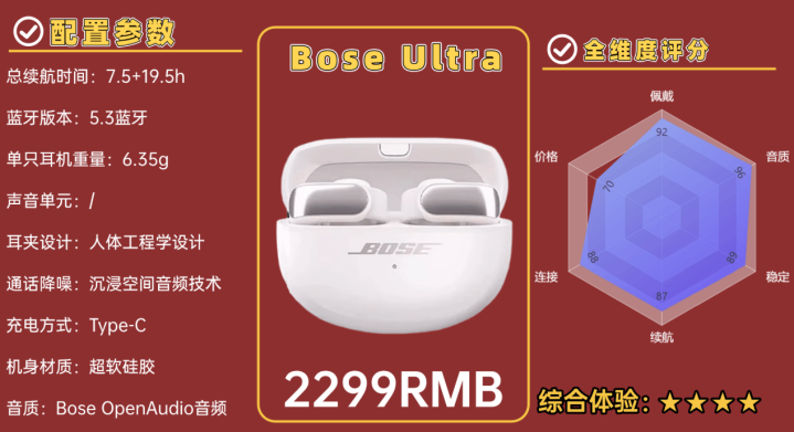其他功能:内置蓝牙5.3芯片,连接稳定、延迟低。单次续航约7小时,配合充电盒总续航约20小时。支持IPX4防水等级,可防汗防泼溅。作为高端旗舰开放式耳机,其综合性能与舒适体验均属顶级水准。